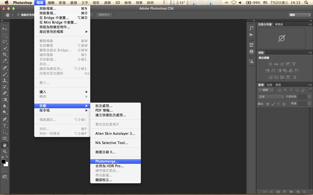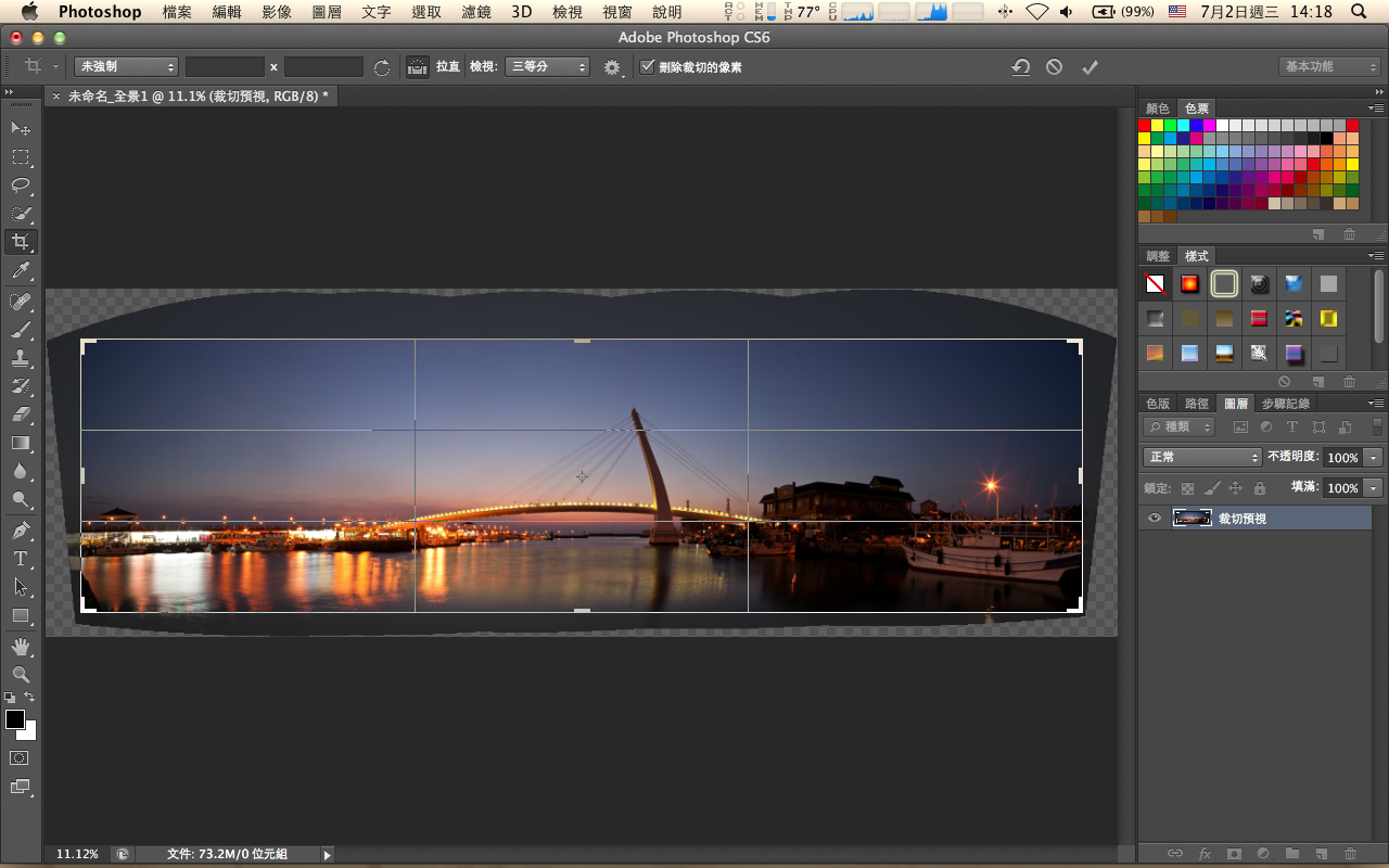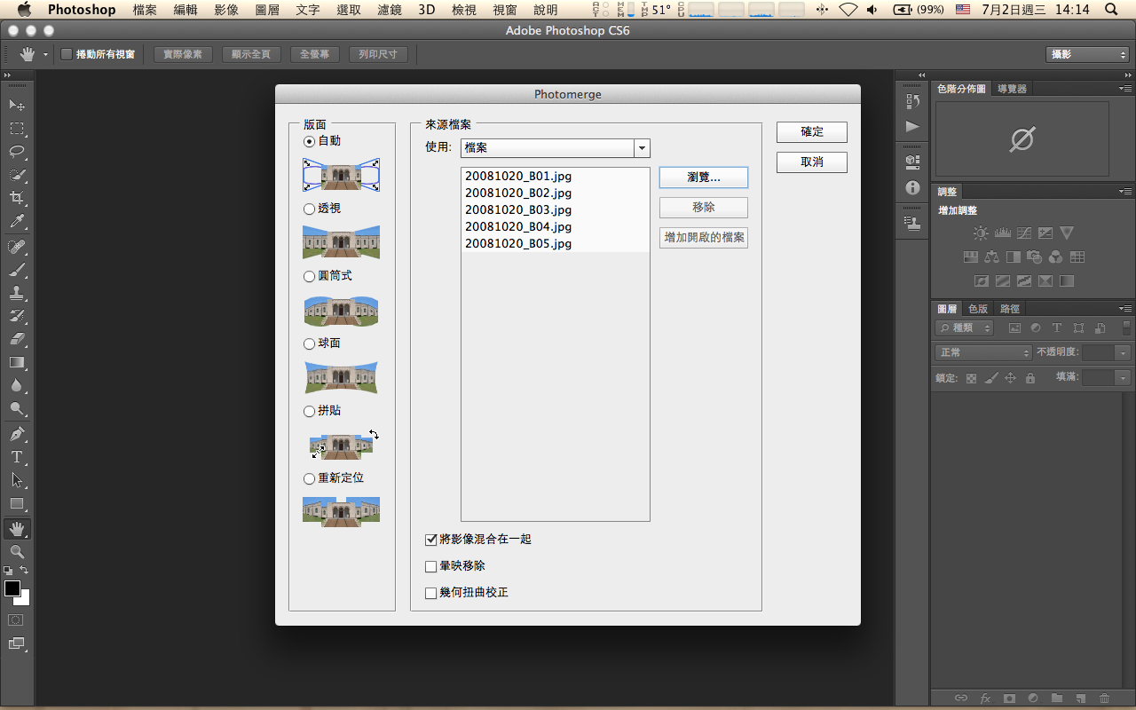 <a href="http://3.bp.blogspot.com/-GZE0hToo3sw/U7QltOkO2LI/AAAAAAAAFPY/E8Xvanlspbg/s1600/20081020%E6%BC%81%E4%BA%BA%E7%A2%BC%E9%A0%ADB.jpg"><img border="0" height="114" src="https://images-blogger-opensocial.googleusercontent.com/gadgets/proxy?url=http%3A%2F%2F3.bp.blogspot.com%2F-GZE0hToo3sw%2FU7QltOkO2LI%2FAAAAAAAAFPY%2FE8Xvanlspbg%2Fs1600%2F20081020%25E6%25BC%2581%25E4%25BA%25BA%25E7%25A2%25BC%25E9%25A0%25ADB.jpg&container=blogger&gadget=a&rewriteMime=image%2F*" width="400" /></a><br />相較於Photoshop CS6隱藏版的影片功能,用Photomerge拼接全景更可以簡單地搞定。<br /><br />一、開啟Photoshop CS6,選擇功能表 檔案 / 自動/Photomerge。<br /><a href="http://2.bp.blogspot.com/-NuX5sOIskGg/U7QhLKiOa8I/AAAAAAAAFOs/bse6ZDbrrsI/s1600/20140702_01.png"><img border="0" height="250" src="https://images-blogger-opensocial.googleusercontent.com/gadgets/proxy?url=http%3A%2F%2F2.bp.blogspot.com%2F-NuX5sOIskGg%2FU7QhLKiOa8I%2FAAAAAAAAFOs%2Fbse6ZDbrrsI%2Fs1600%2F20140702_01.png&container=blogger&gadget=a&rewriteMime=image%2F*" width="400" /></a><br /><br />二、在「來源檔案」對話框中,導入全景圖資素材。<br /><a href="http://1.bp.blogspot.com/-rBE9O8xGAZw/U7QhLO3Jh0I/AAAAAAAAFOk/fTD9NmNZk8M/s1600/20140702_02.png"><img border="0" height="250" src="https://images-blogger-opensocial.googleusercontent.com/gadgets/proxy?url=http%3A%2F%2F1.bp.blogspot.com%2F-rBE9O8xGAZw%2FU7QhLO3Jh0I%2FAAAAAAAAFOk%2FfTD9NmNZk8M%2Fs1600%2F20140702_02.png&container=blogger&gadget=a&rewriteMime=image%2F*" width="400" /></a><br /><br /> 三、按下「確定」後,PS就開始運算。<br /><a href="http://2.bp.blogspot.com/-ctiRixXYLus/U7QhLMVevzI/AAAAAAAAFOo/viIknQHVsVk/s1600/20140702_04.png"><img border="0" height="250" src="https://images-blogger-opensocial.googleusercontent.com/gadgets/proxy?url=http%3A%2F%2F2.bp.blogspot.com%2F-ctiRixXYLus%2FU7QhLMVevzI%2FAAAAAAAAFOo%2FviIknQHVsVk%2Fs1600%2F20140702_04.png&container=blogger&gadget=a&rewriteMime=image%2F*" width="400" /></a><br /><br />四、運算完成後,看到合成圖上有著看似龜裂的紋路。<br /> 別擔心,選擇功能表 圖層 / 影像平面化,裂紋就消失了。<br /><a href="http://2.bp.blogspot.com/-Axq3yeOQX3I/U7QhMHcIoaI/AAAAAAAAFOw/ijOOb1E1LPo/s1600/20140702_05.png"><img border="0" height="250" src="https://images-blogger-opensocial.googleusercontent.com/gadgets/proxy?url=http%3A%2F%2F2.bp.blogspot.com%2F-Axq3yeOQX3I%2FU7QhMHcIoaI%2FAAAAAAAAFOw%2FijOOb1E1LPo%2Fs1600%2F20140702_05.png&container=blogger&gadget=a&rewriteMime=image%2F*" width="400" /></a><br /><br />五、選擇「裁切」工具,將多餘的邊緣去除後儲存檔案。<br /><a href="http://3.bp.blogspot.com/-dNA_nmmsbIQ/U7QhMQigNEI/AAAAAAAAFO0/Ixy8lwsklqY/s1600/20140702_06.png"><img border="0" height="250" src="https://images-blogger-opensocial.googleusercontent.com/gadgets/proxy?url=http%3A%2F%2F3.bp.blogspot.com%2F-dNA_nmmsbIQ%2FU7QhMQigNEI%2FAAAAAAAAFO0%2FIxy8lwsklqY%2Fs1600%2F20140702_06.png&container=blogger&gadget=a&rewriteMime=image%2F*" width="400" /></a><br />就這五個步驟就搞定全景像片,夠輕鬆了吧。<br /><div><br /></div>