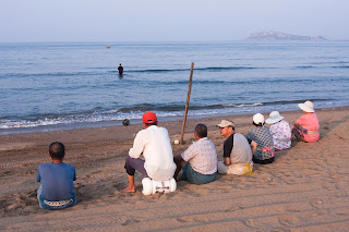 五點多終於看到十多位村民陸續帶著器具來到海灘,分組合力抬出漁網及沙灘上的膠筏,依序將網具及繩索放入膠筏,再將膠筏推下水,由四位村民搖著櫓划向海中,等待魚群游近再下網。幾位村民坐在沙灘上等待幫忙收網,一同期待豐收的成果,據說遊客參予拉網的也可分享漁獲。